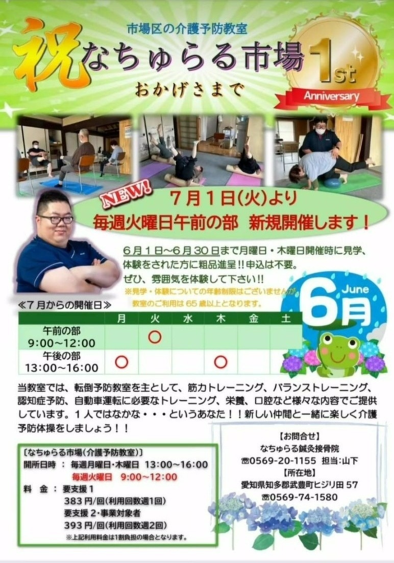 ありがたい事に去年の6月からスタートした介護予防教室なちゅらる市場。皆さんに支えられ無事に1周年を迎え、今月曜日と木曜日の13時から16時でストレッチ、筋トレを中心に体操をさせてもらっているのですが各教室定員10名のところほぼほぼ満員になり、新しく火曜日の9時から12時の教室を開く運びとなりました。