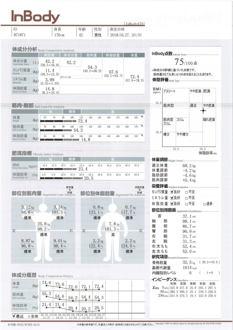 僕は②に参加するのですがInbodyを測っても筋肉量はALL高レベルをたたき出しているのですが脂肪量も桁違いの数字を記録しているのでこの点数が皆さんよりとても低く出されております。