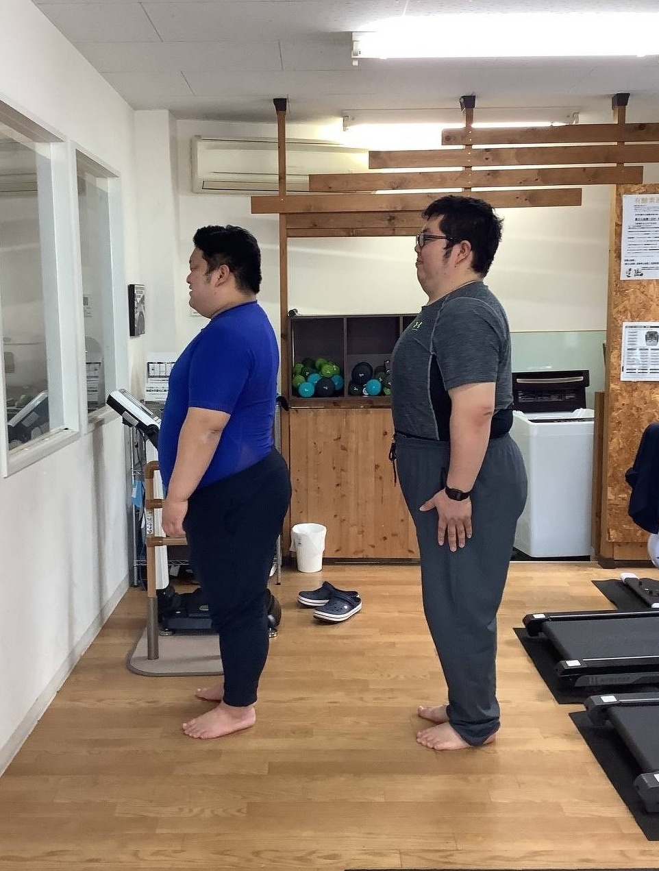まずは写真をご覧ください。こちら、11月22日(いい夫婦の日)の業後に体重測定&体型撮影を行った場面です。