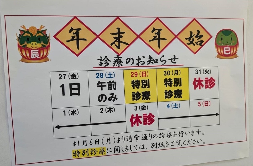12月28日土曜日 午前のみ 12月29日日曜日・30日月曜日 特別診療 12月31日火曜日~1月5日日曜日 休診 1月6日月曜日より通常通りの診療となります。