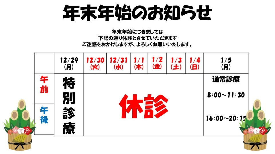 12/27(土) 午前のみ 12/29(月) 特別診療 12/30(火)〜1/4(日) 休診 1/5(月)より通常診療を行います ご迷惑をおかけしますがよろしくお願いいたします。